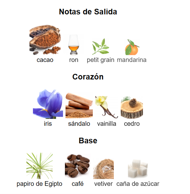 Una cena para dos, en verano, bajo las estrellas. Las conversaciones llegan a su fin. El mantel está manchado y arrugado. Se sirve café, ron y chocolates. Una brisa cálida y tranquila, una deliciosa danza de aromas. La indulgencia del cacao y la calidez del ron se equilibran con el carácter amaderado del papiro.